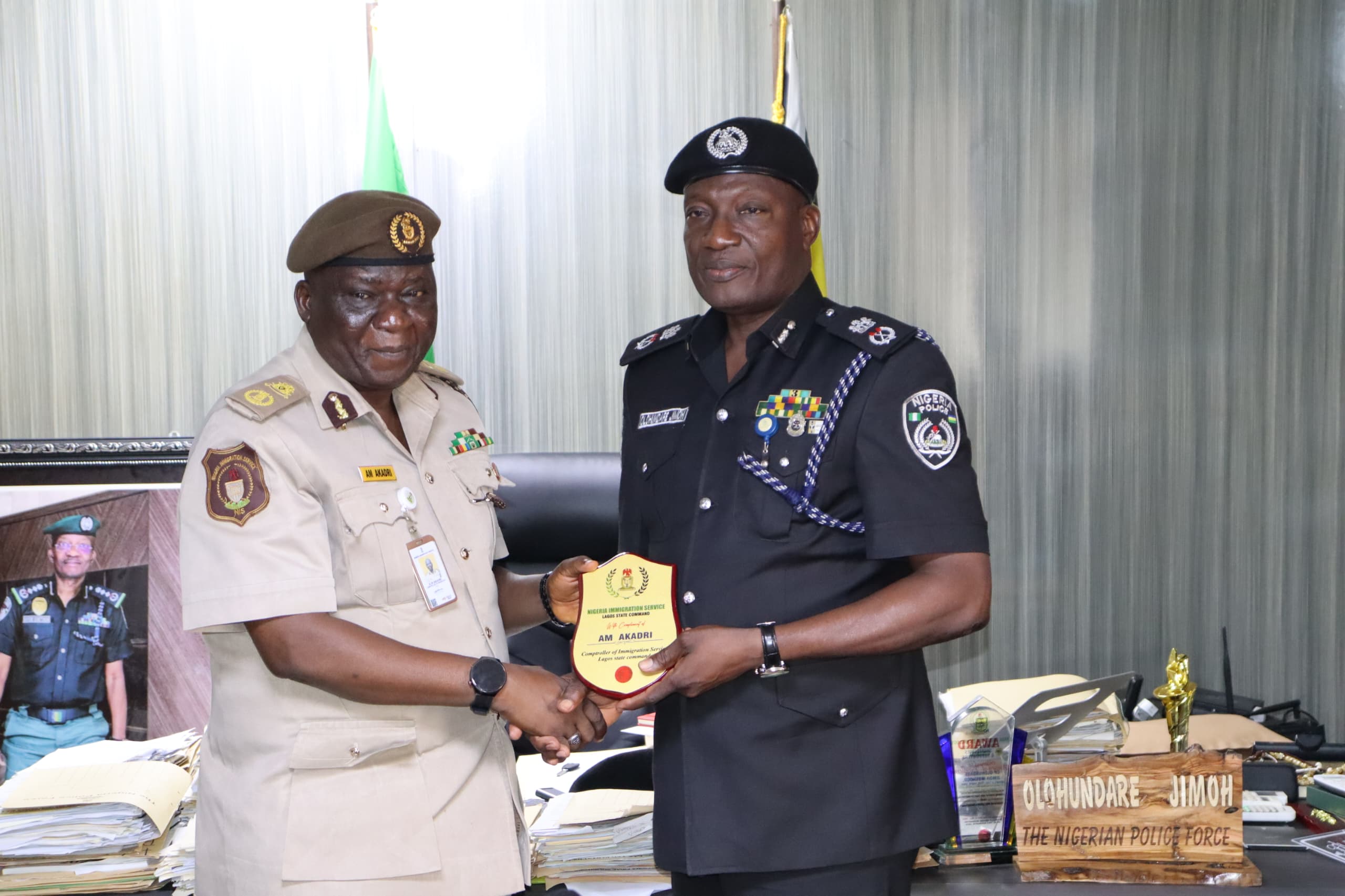 The Lagos State Command of the Nigeria Police Force on Tuesday, received a high-powered delegation from the Nigeria Immigration Service (NIS) led by the Lagos State Comptroller of Immigration, Mr. Aliu Muhammed Akadri, who paid a courtesy visit to Commissioner of Police, CP Olohundare Moshood Jimoh, at the Command Headquarters in Ikeja.