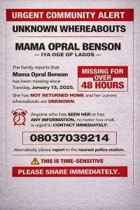FAMILY DECLARES IYA OGE OF LAGOS, OPRAL BENSON, MISSING