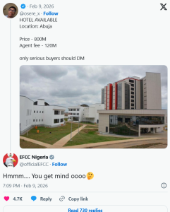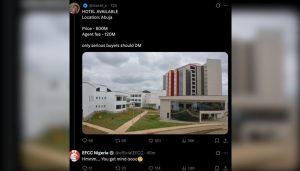 On X, a Nigerian user named @osere_x listed the EFCC building as a “hotel” in Abuja, saying it was for sale at N800 million, with an extra N120 million for agent fees.